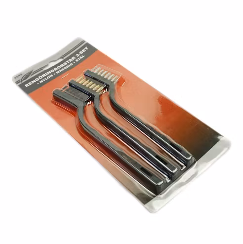 Tre stycken rengöringsborstar i tre olika material: Nylon, mässing, stål. Utmärkt att ha till att göra rent saker med i ex. garaget.