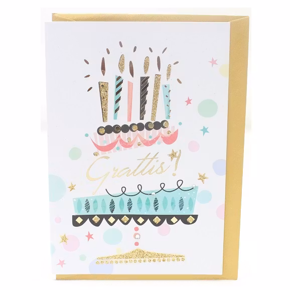 Fint Kort att ge bort till den som fyller år! Ingår ett guldigt kuvert. Är guldigt glitter på så väldigt festligt kort!