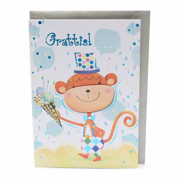 Grattiskort Apa 15 kr I lager KÖP Information Gulligt glittrigt Grattiskort med Apa på! Silverfärgat kuvert ingår.