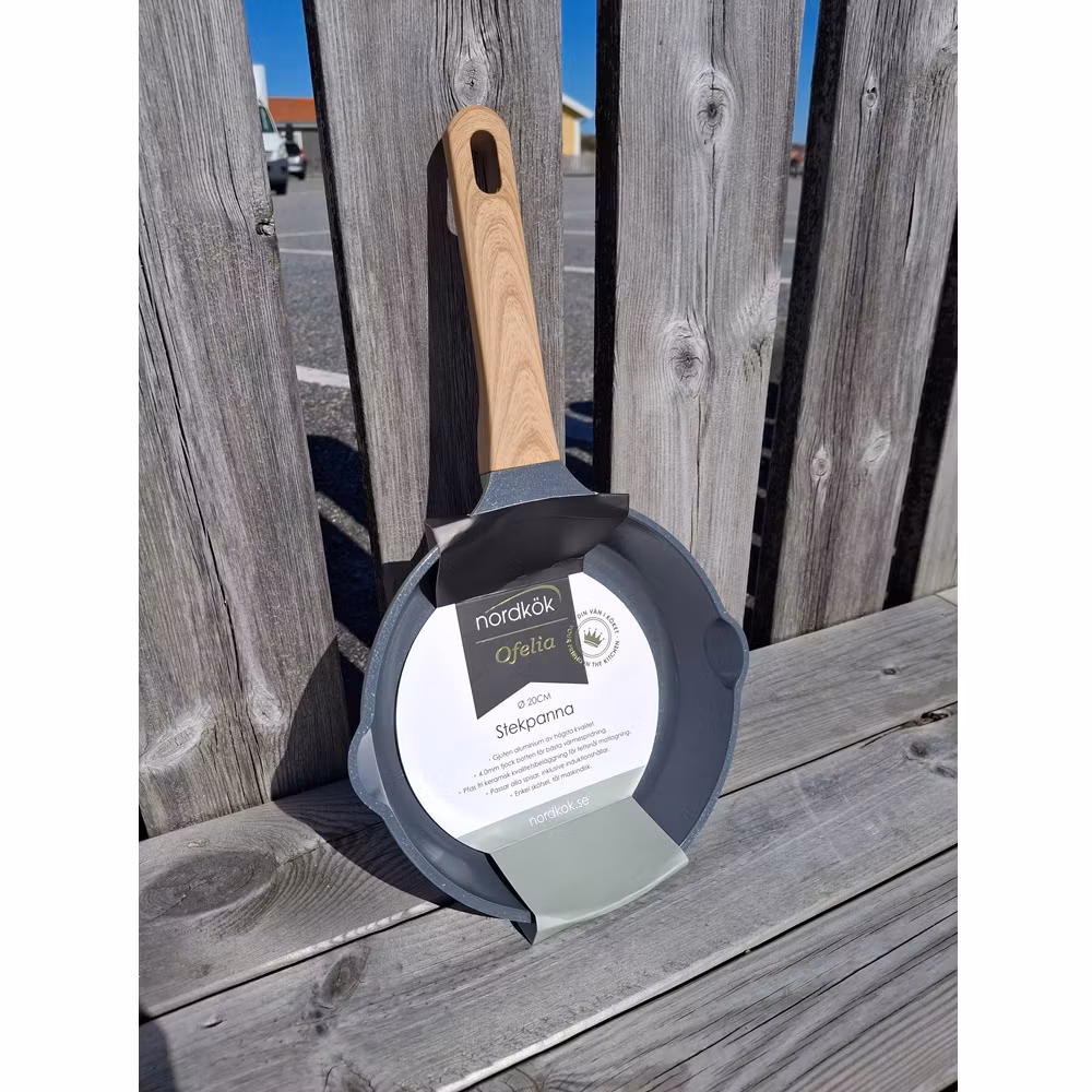 Denna stekpanna är tillverkad i gjuten aluminium som är ett material av mycket hög kvalité. Invändigt har en keramisk beläggning. Handtaget är i träimitation med en softgrip känsla så mycket skön att hålla i. Stekpannan har 5mm tjock botten för jämn snabb värmefördelning. Passar även induktionshäll.